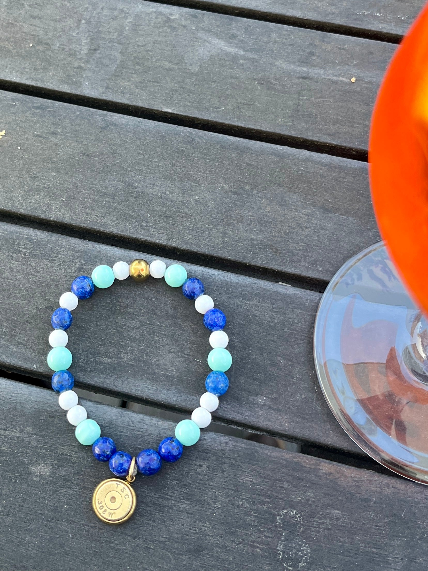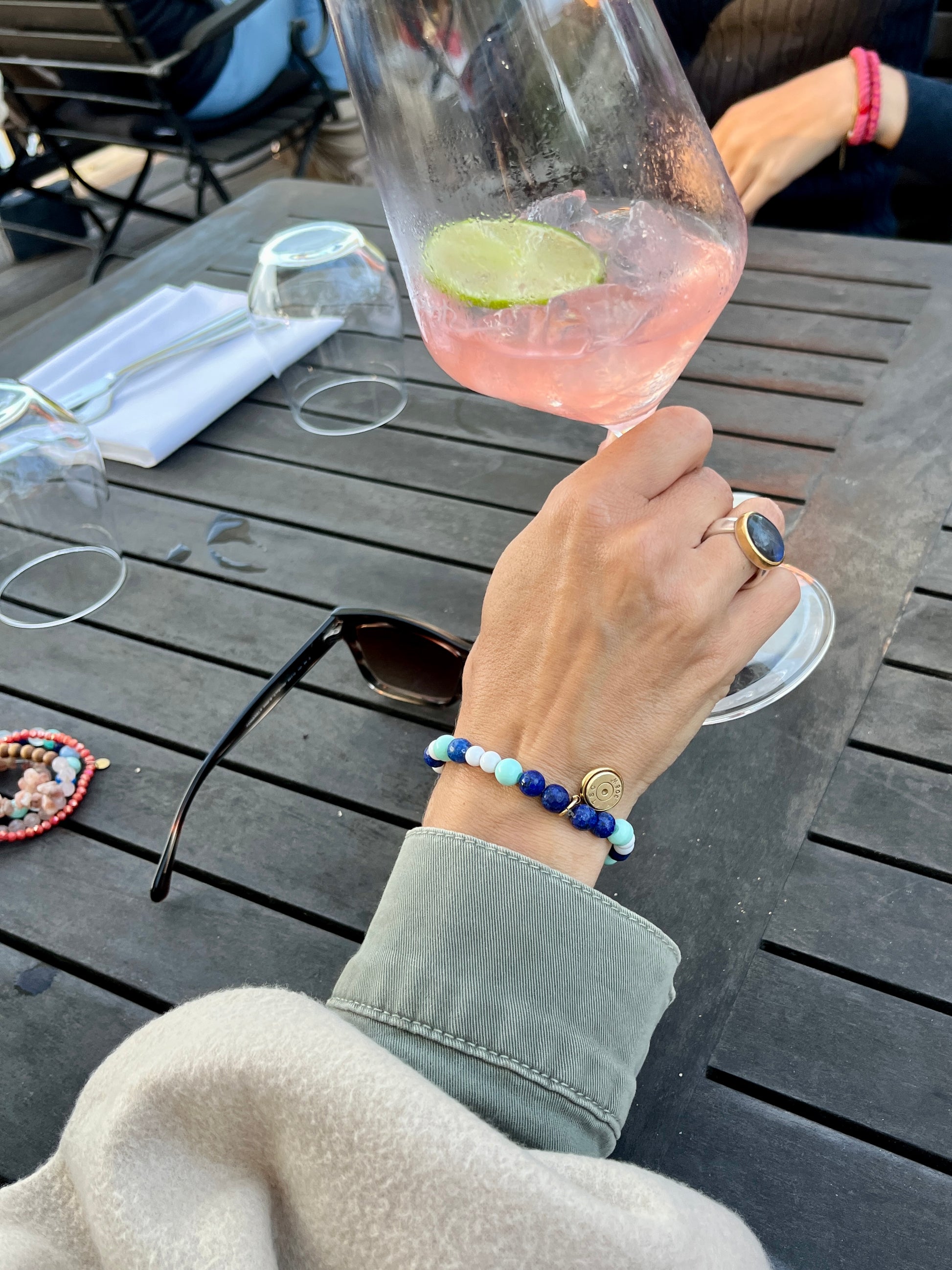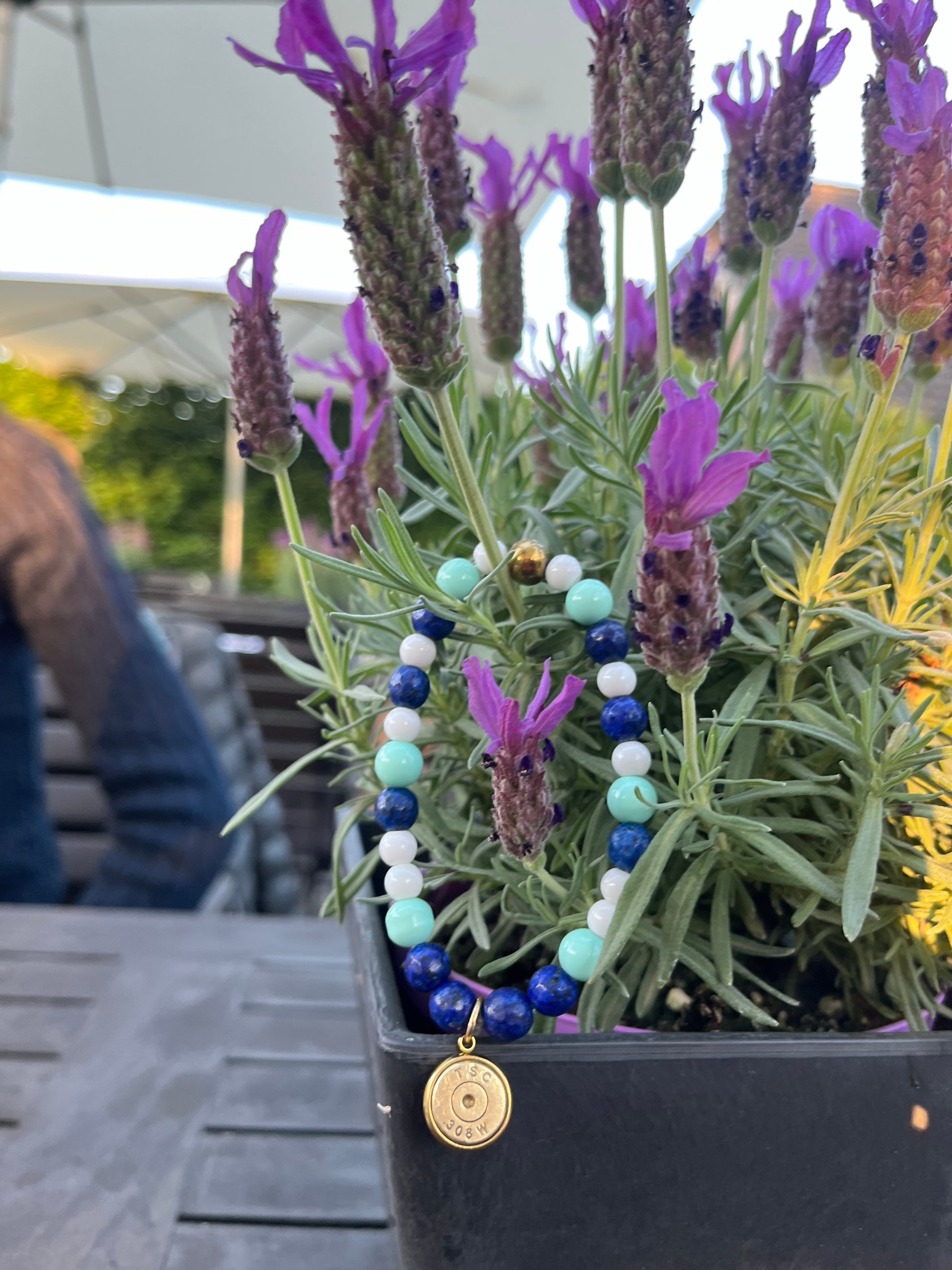 Das Armband “Daisy“ ist aus Naturstein- und Acryl Perlen gefertigt. Die Farben lassen das Armband zu jedem Outfit passen und mit der Patrone als Anhänger wirkt es elegant und besonders, wie ein unauffälliges Statement.