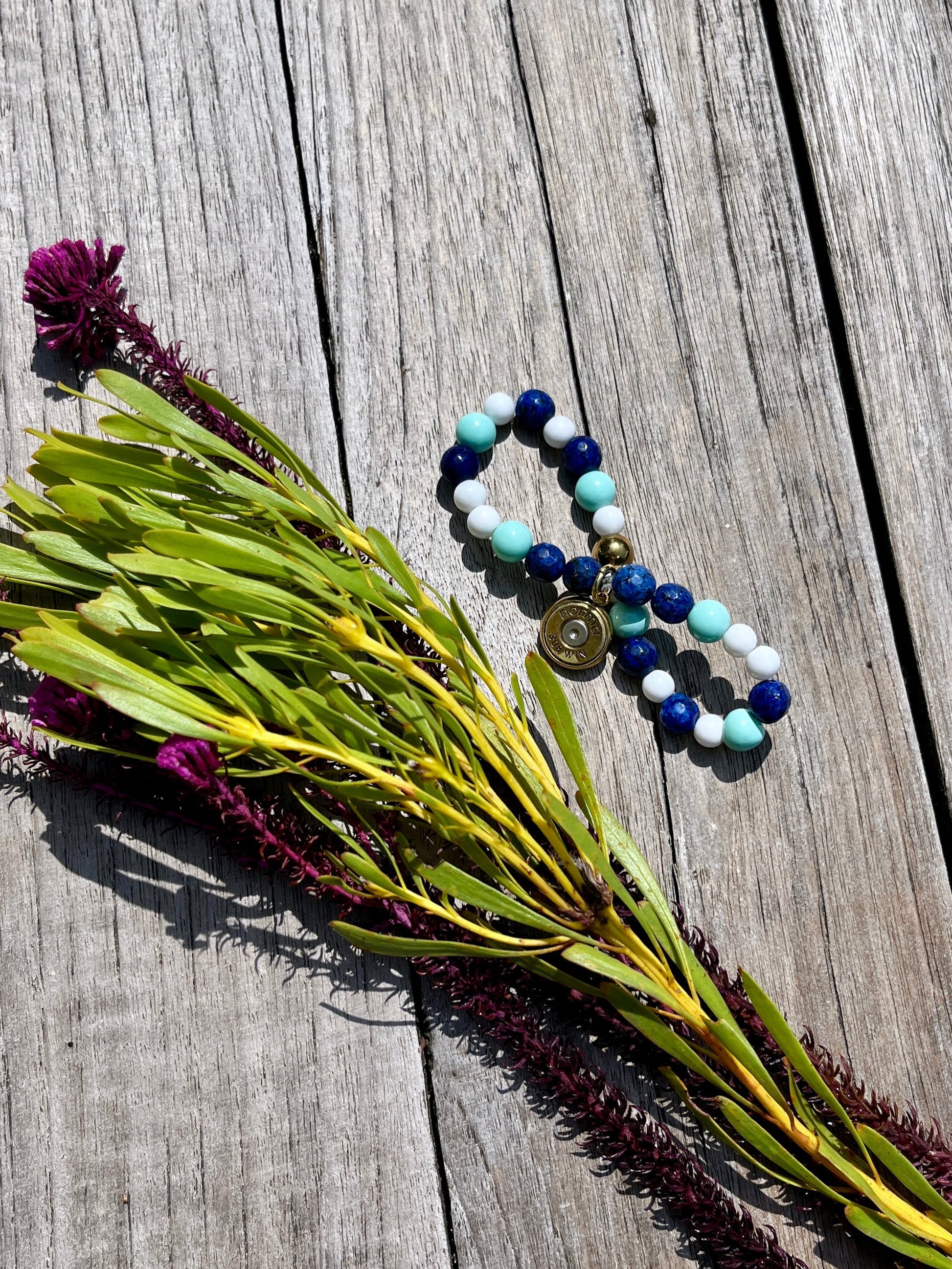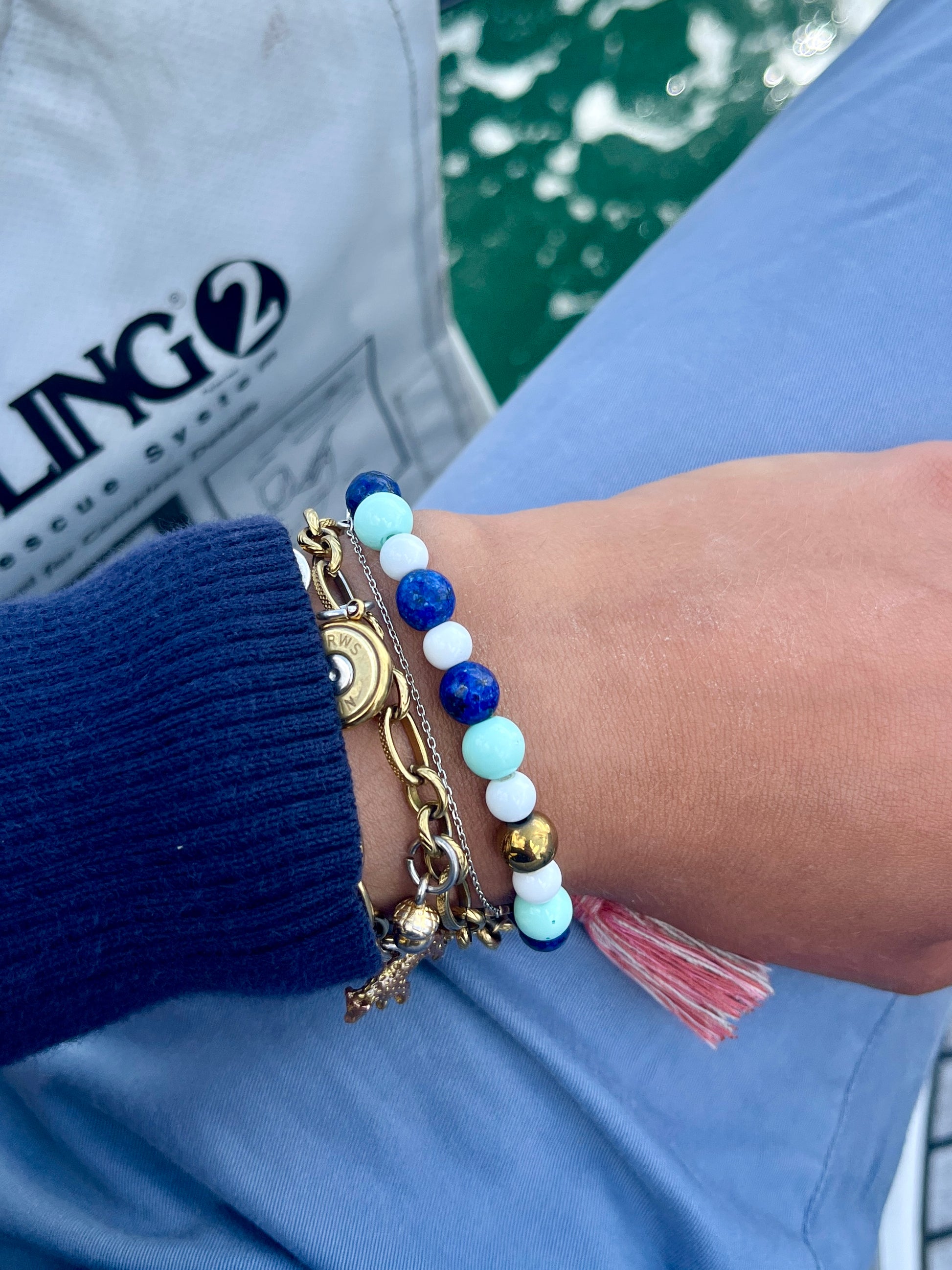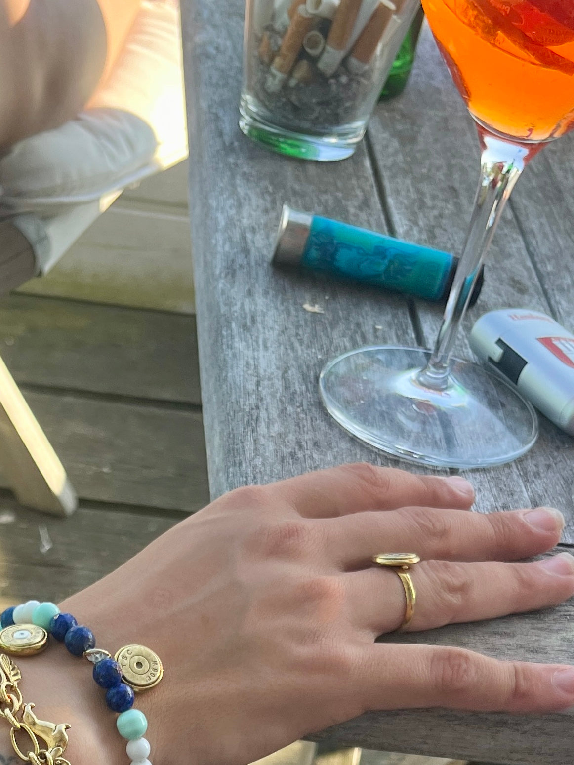 Das Armband “Daisy“ ist aus Naturstein- und Acryl Perlen gefertigt. Die Farben lassen das Armband zu jedem Outfit passen und mit der Patrone als Anhänger wirkt es elegant und besonders, wie ein unauffälliges Statement.