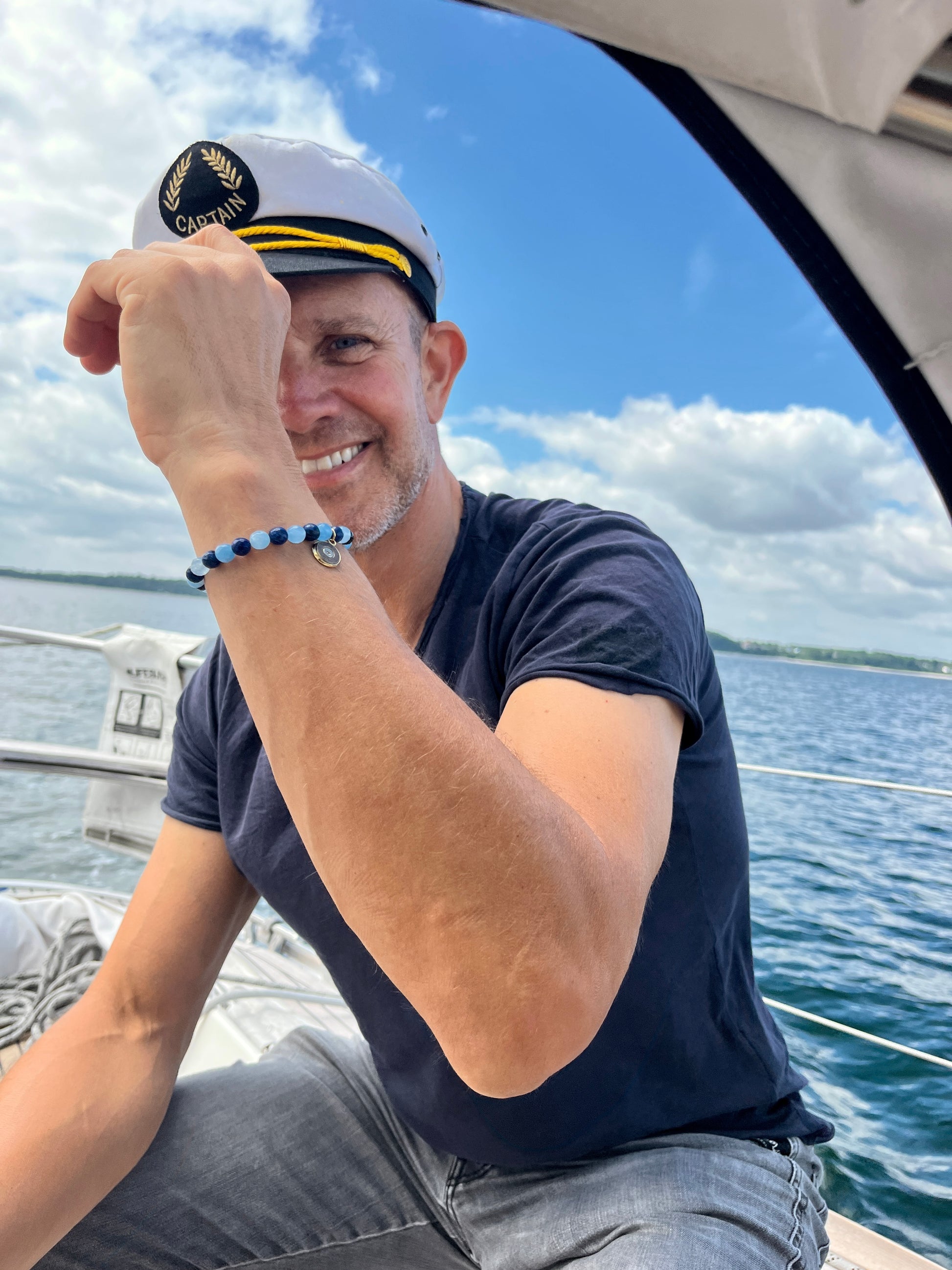 Das "Captain's Bracelet" ist komplett aus Natursteinperlen gefertigt. Die verschiedenen Blautöne machen das Armband perfekt für die See oder jedem Outfit, mit der Patrone als Anhänger wirkt es elegant und besonders, wie ein unauffälliges Statement.