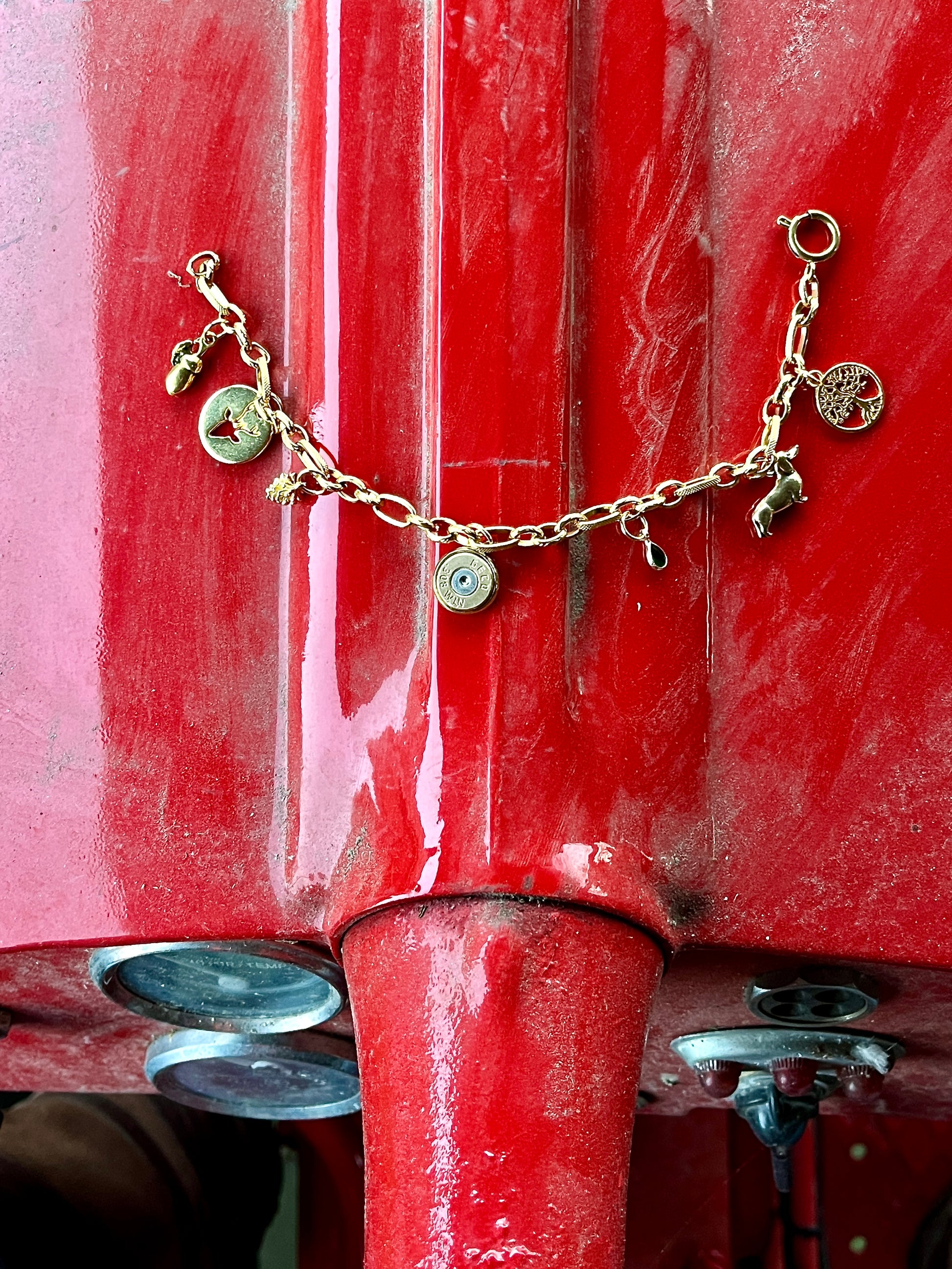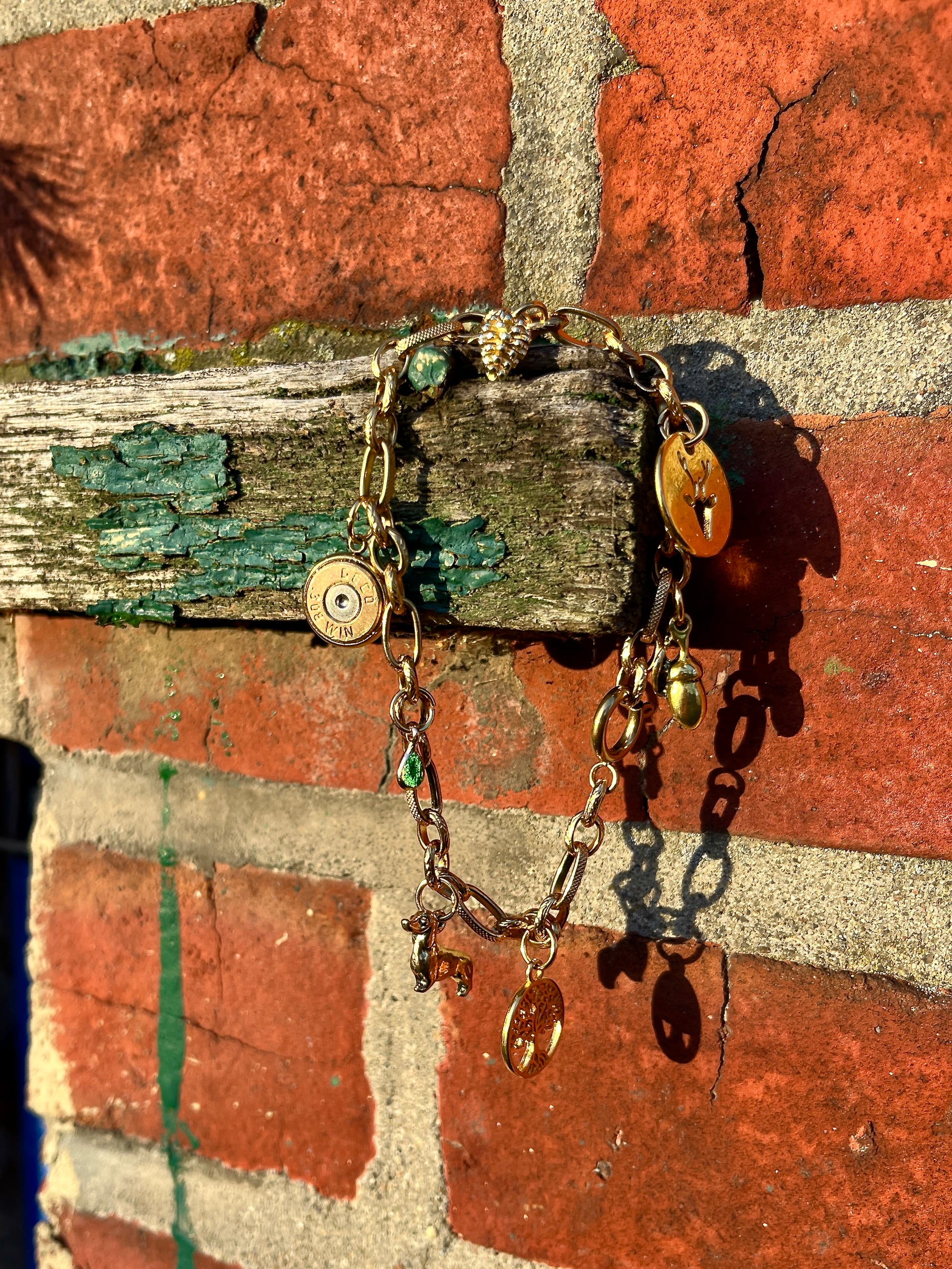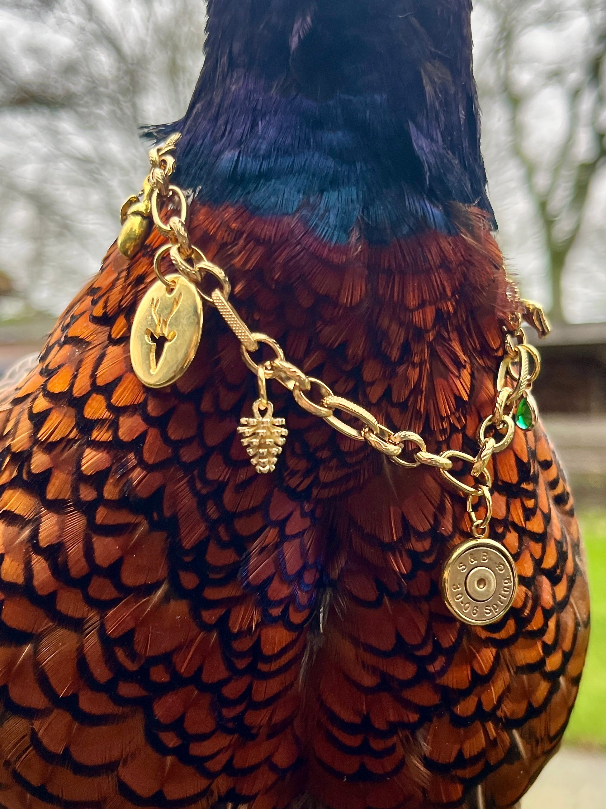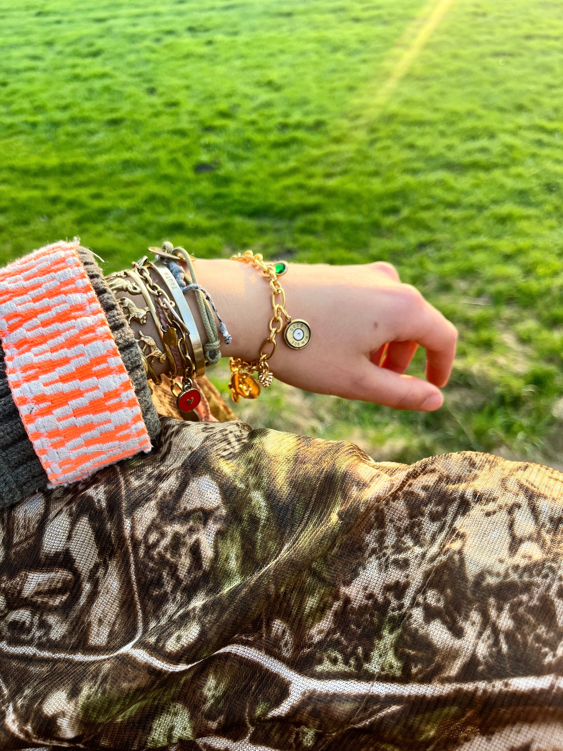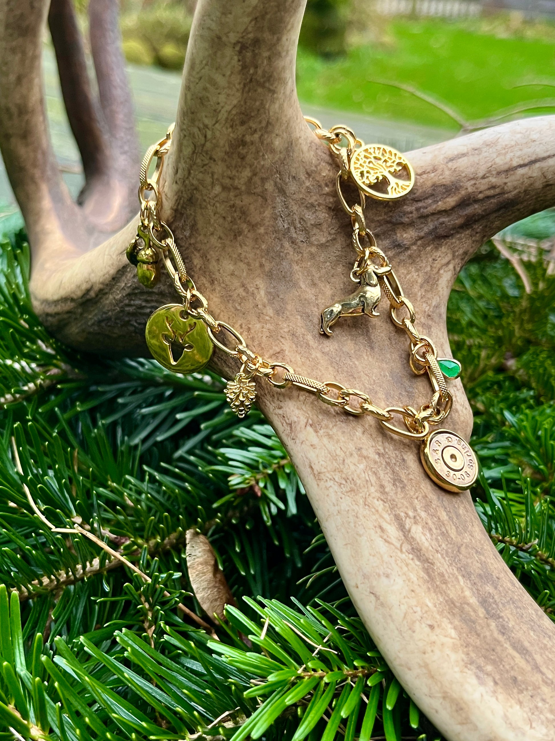 Das Charm-Bracelet ”Hunter” ist aus vergoldetem Edelstahl gefertigt, sowie auch einige der Anhänger. Dadurch verlieren sie den Glanz nicht so schnell und können auch beim Duschen getragen werden. Die Anhänger sind nach dem Thema der Jagd ausgewählt, daher eignet sich das Armband hervorragend als Geschenk für Jagdpassionierte.