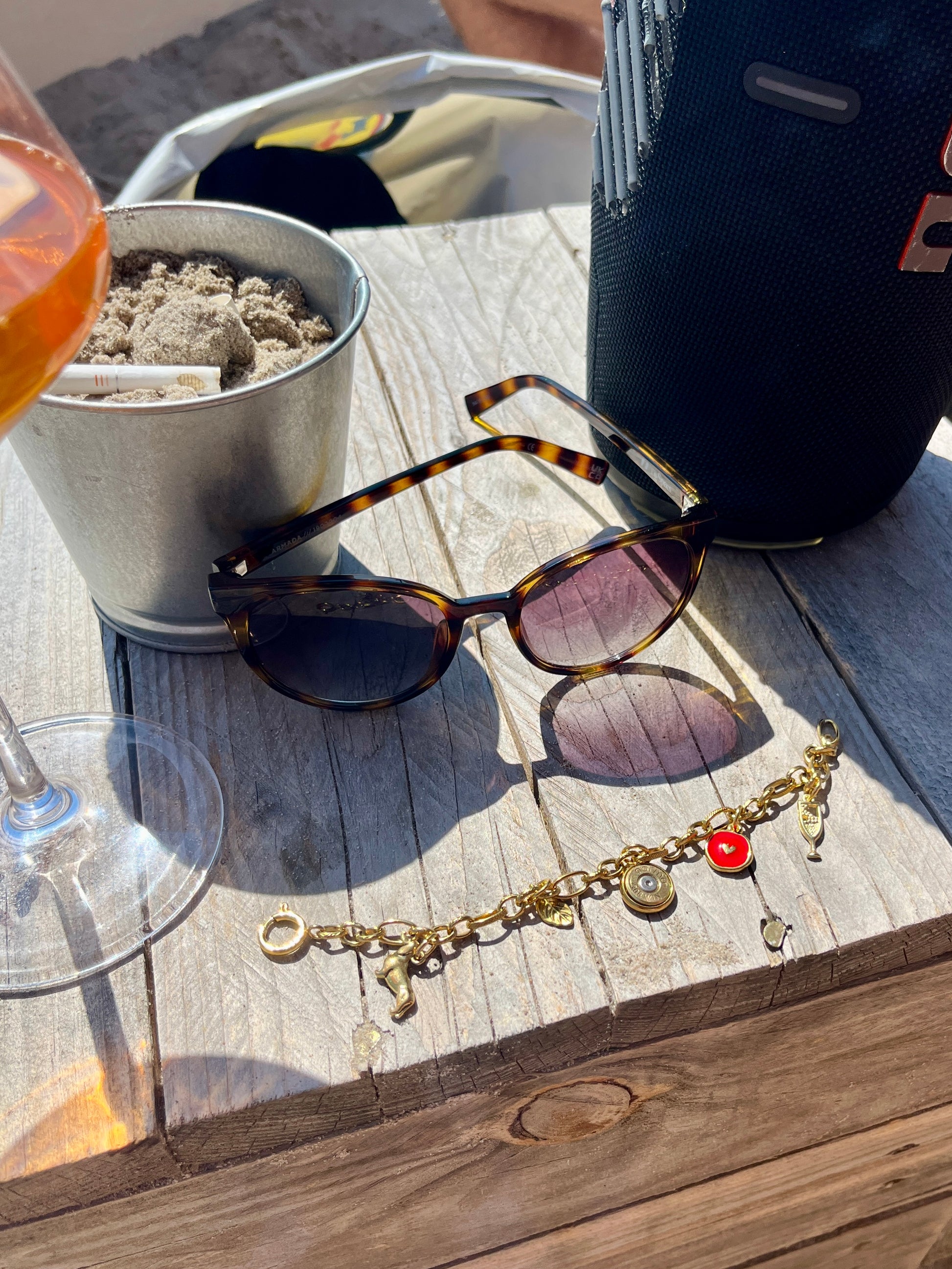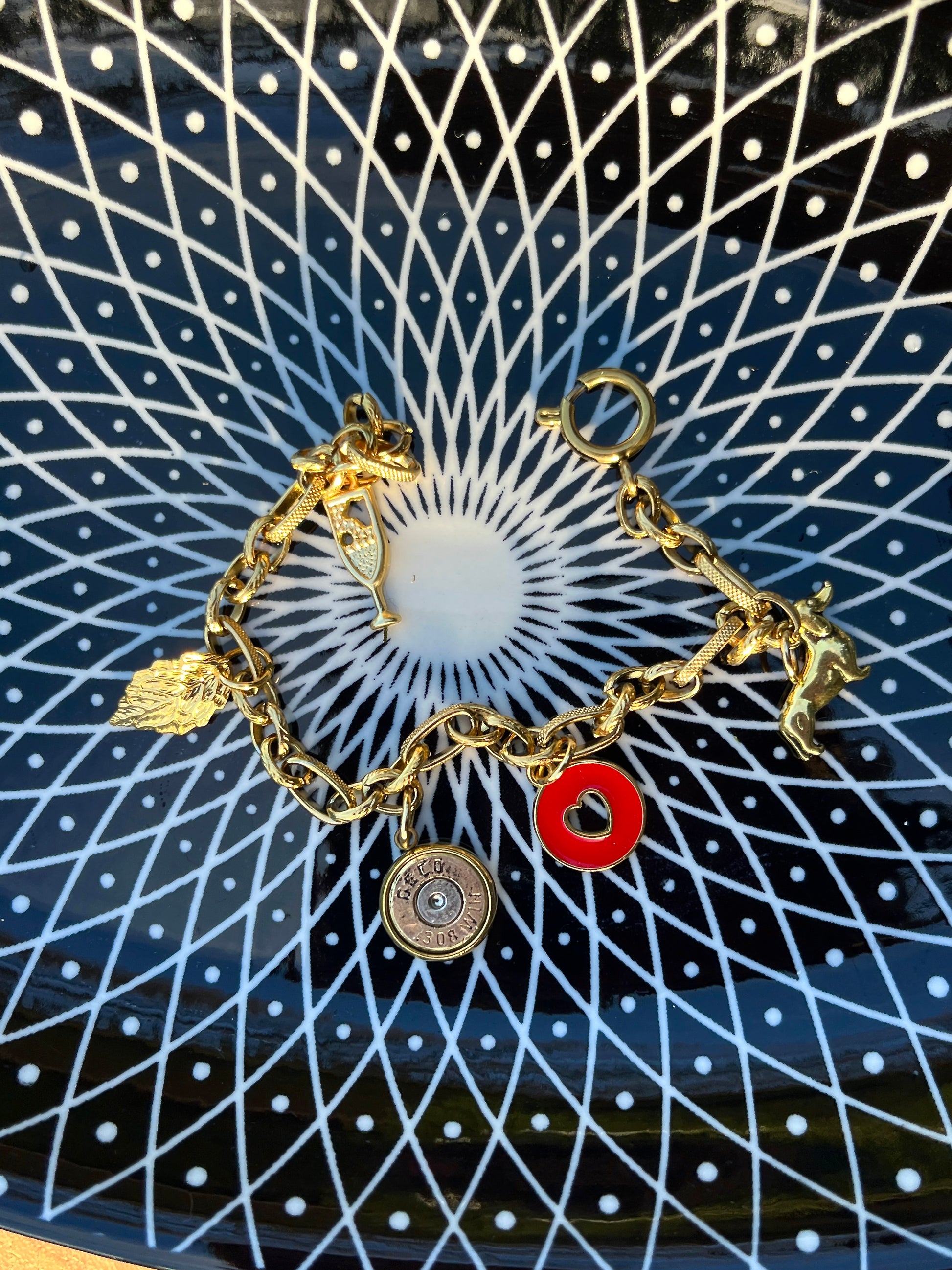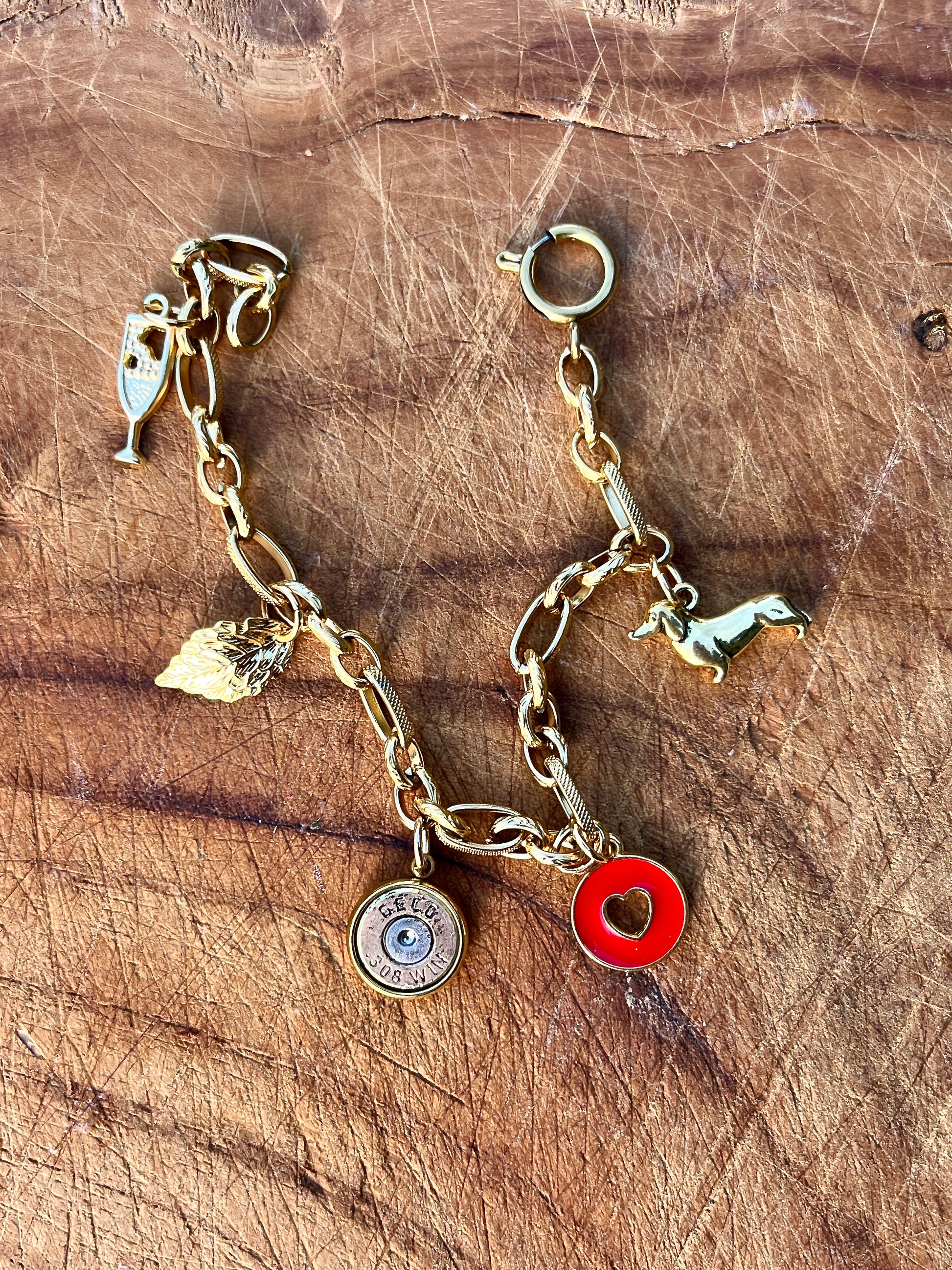 Das Charm-Bracelet “Jule” ist aus vergoldetem Edelstahl gefertigt, so wie auch einige der Anhänger. Der Dackel als Anhänger harmoniert mit dem Herz und dem Champagner Glas ganz hervorragend und spiegelt Liebe in alle Richtungen wieder.