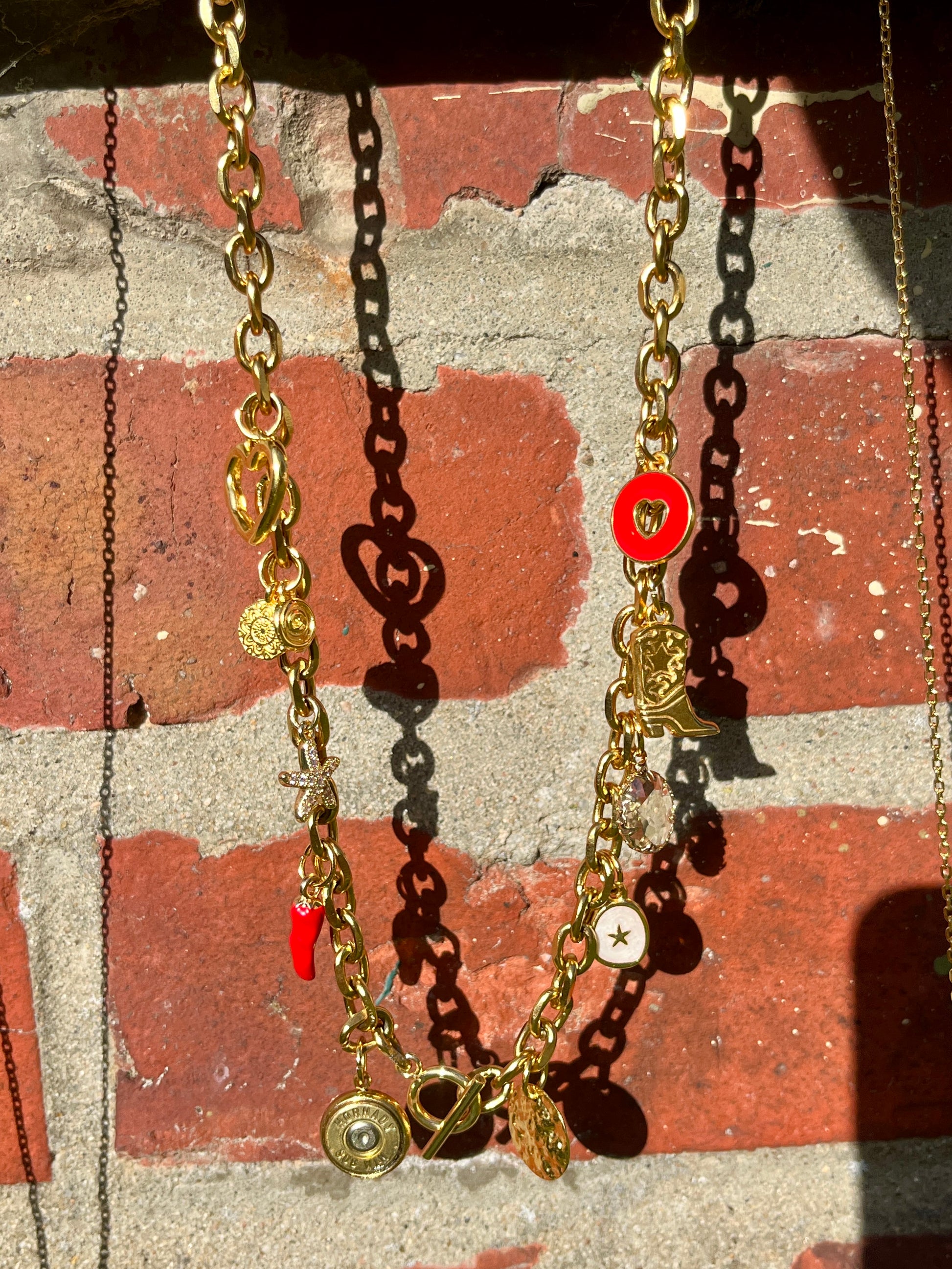 Die Charm Kette ist aus vergoldetem Edelstahl gefertigt, sowie einige der Anhänger auch. Edelstahl ist ein sehr robustes Material und verfärbt bei Kontakt mit Wasser oder Schweiß nicht so leicht. Die verschiedenen Anhänger wurden mit Bedacht ausgewählt, um dir eine möglichst hohe Qualität zu liefern.