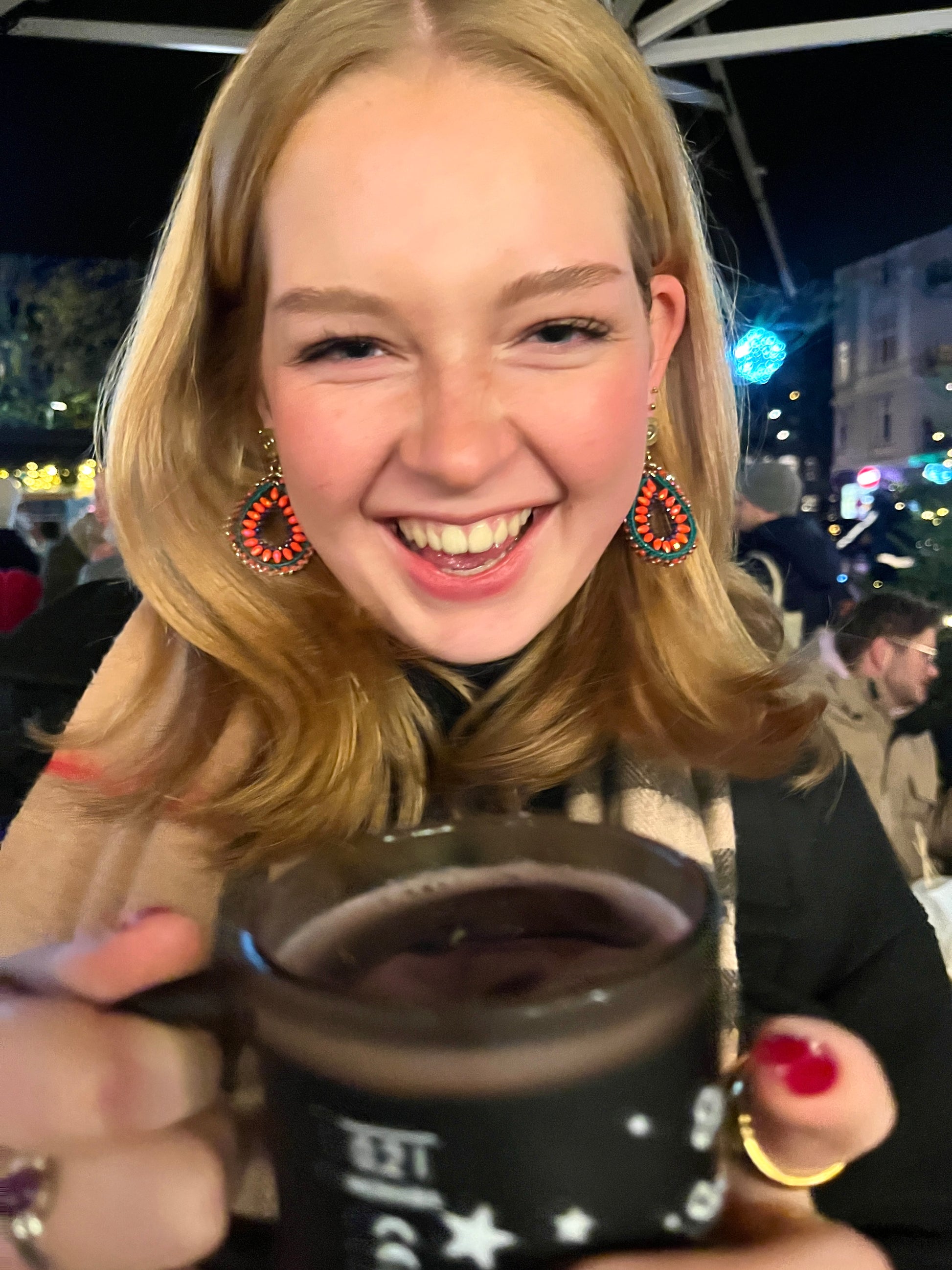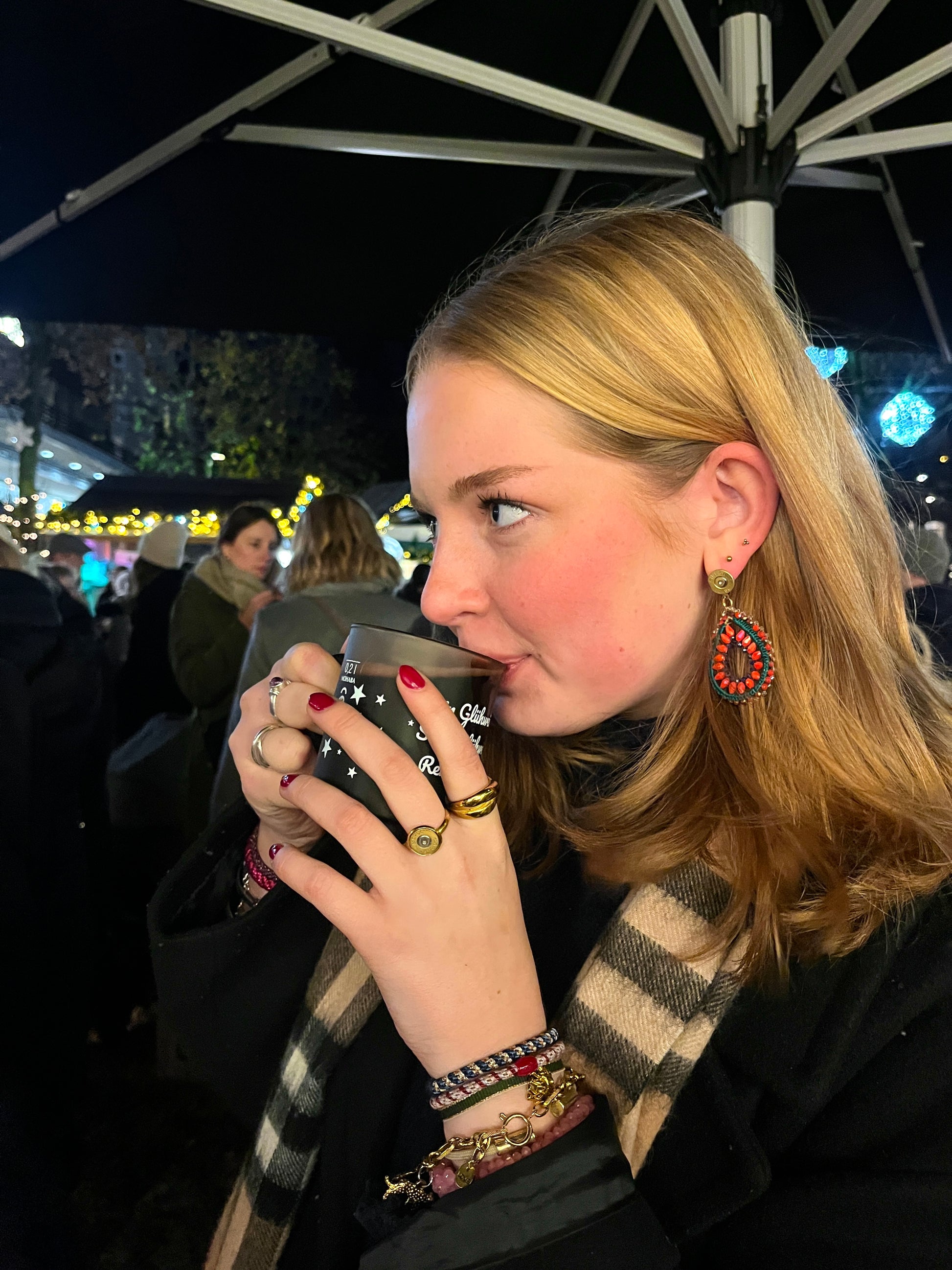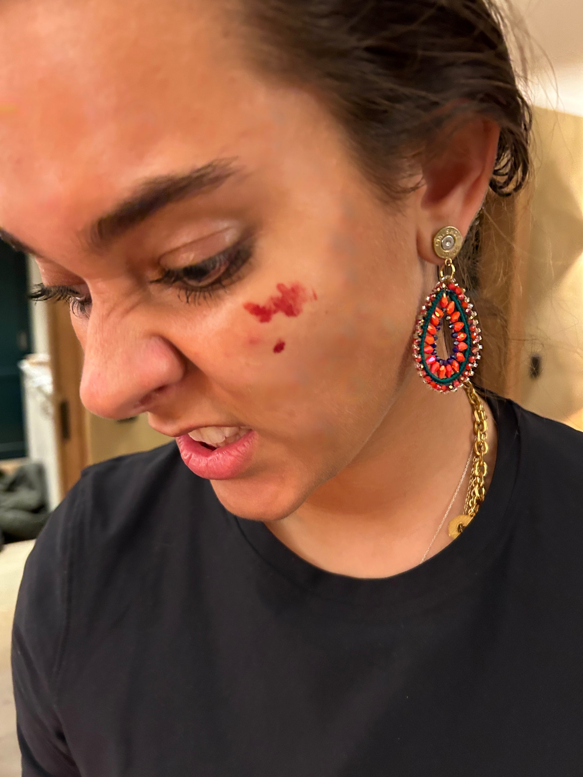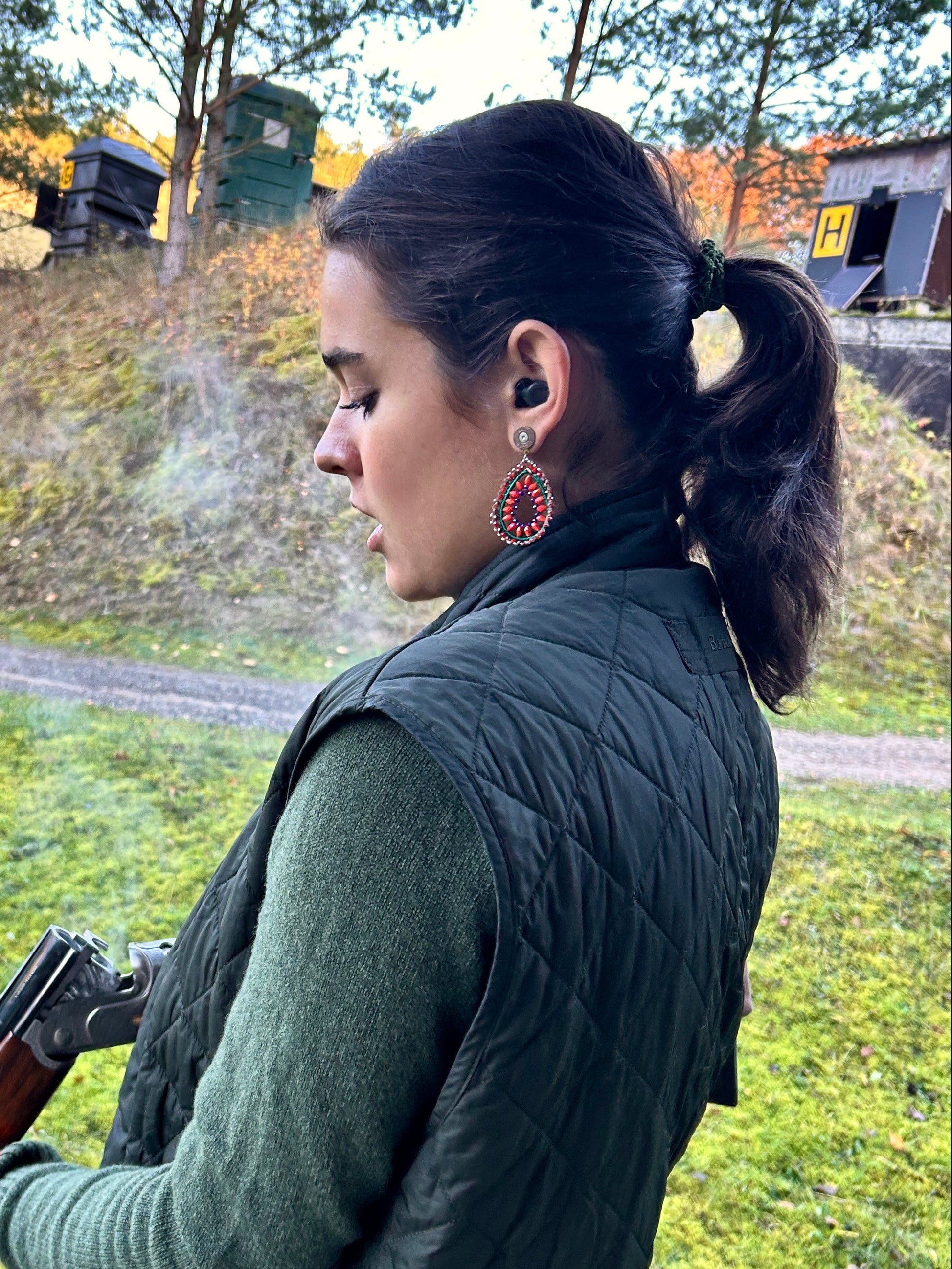 Dieses traumhafte Paar Ohrringe ist perfekt für die herbstliche Jahreszeit geeignet. Die Tropfenform harmoniert wunderbar mit dem kräftigen Rot sowie den grünen und blauen Perlen. Die Patronen in gold bringen den perfekten Kontrast zu den "Dropped" Ohrringen.