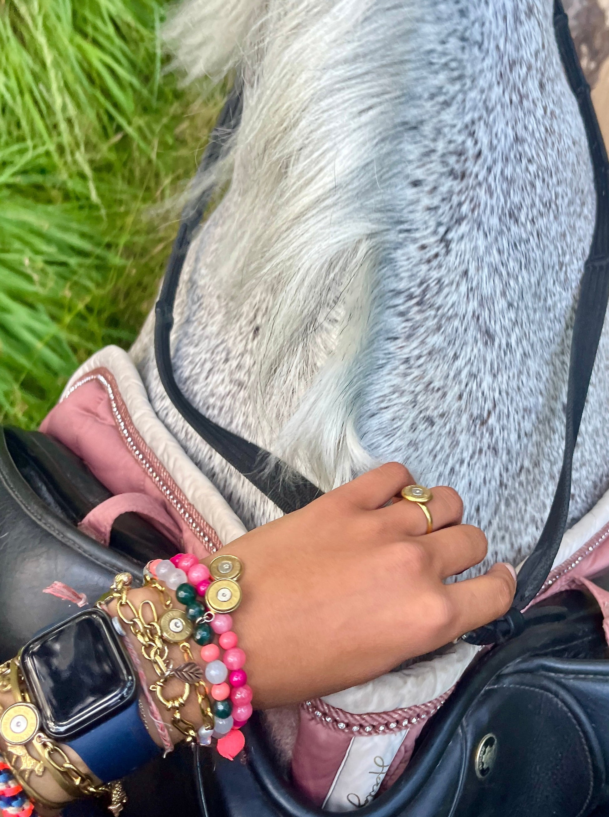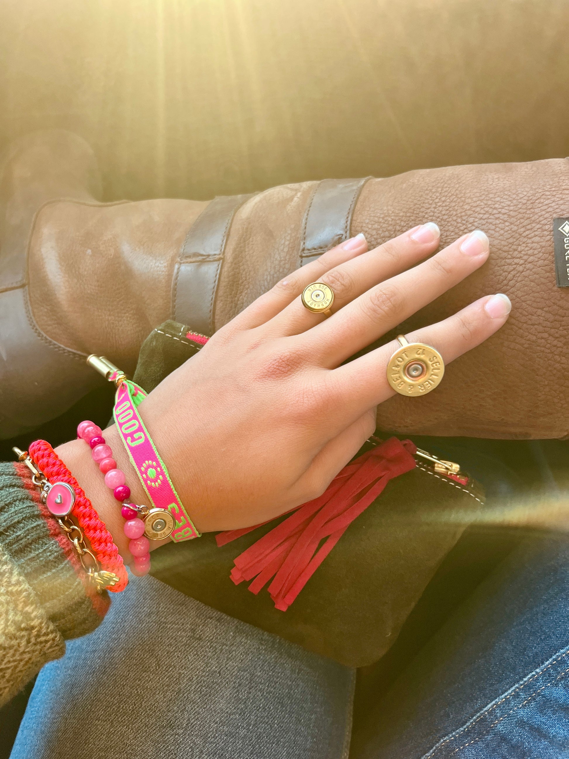 Das Armband “Feeling Pink“ ist aus Naturstein- und Acryl Perlen gefertigt. Die Verschiedenen Pink Töne lassen jeden Mood und jedes Outfit aufhellen und mit der Patrone als Anhänger wirkt es elegant und besonders, wie ein unauffälliges Statement.